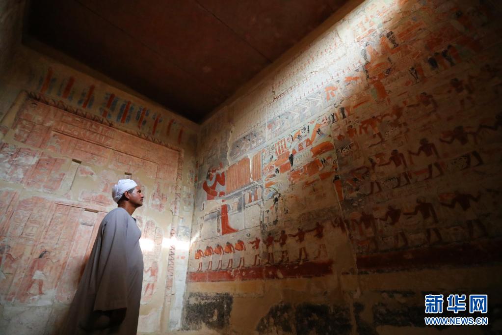 8月3日,看墓人在埃及首都开罗以南的塞加拉地区一个官员墓内巡视彩绘浮雕壁画。 塞加拉地区是古埃及文明核心遗址所在地,位于开罗以南约30公里,多位法老的金字塔和许多贵族的墓地就位于此。在众多距今4000多年的古墓内,尚有保存完好且体现古埃及贵族地位及百姓日常生活等题材的彩绘浮雕壁画。 新华社记者 隋先凯 摄