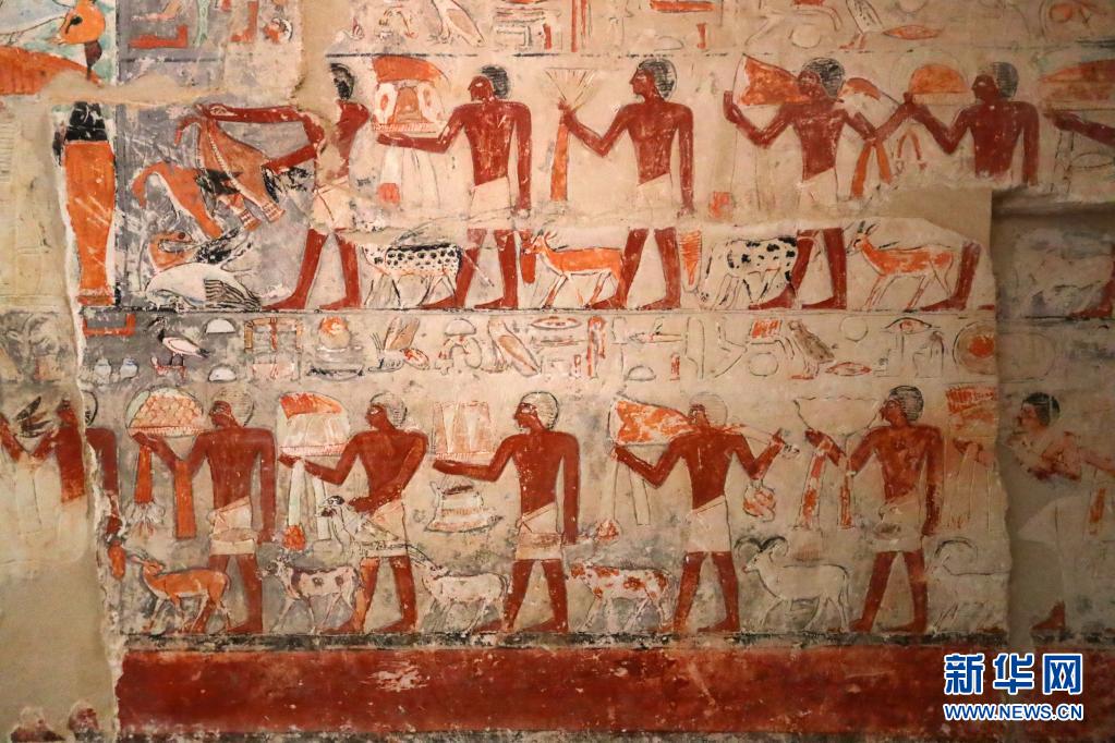 这是8月3日在埃及首都开罗以南的塞加拉地区一个官员墓内拍摄的彩绘浮雕壁画。 塞加拉地区是古埃及文明核心遗址所在地,位于开罗以南约30公里,多位法老的金字塔和许多贵族的墓地就位于此。在众多距今4000多年的古墓内,尚有保存完好且体现古埃及贵族地位及百姓日常生活等题材的彩绘浮雕壁画。 新华社记者 隋先凯 摄