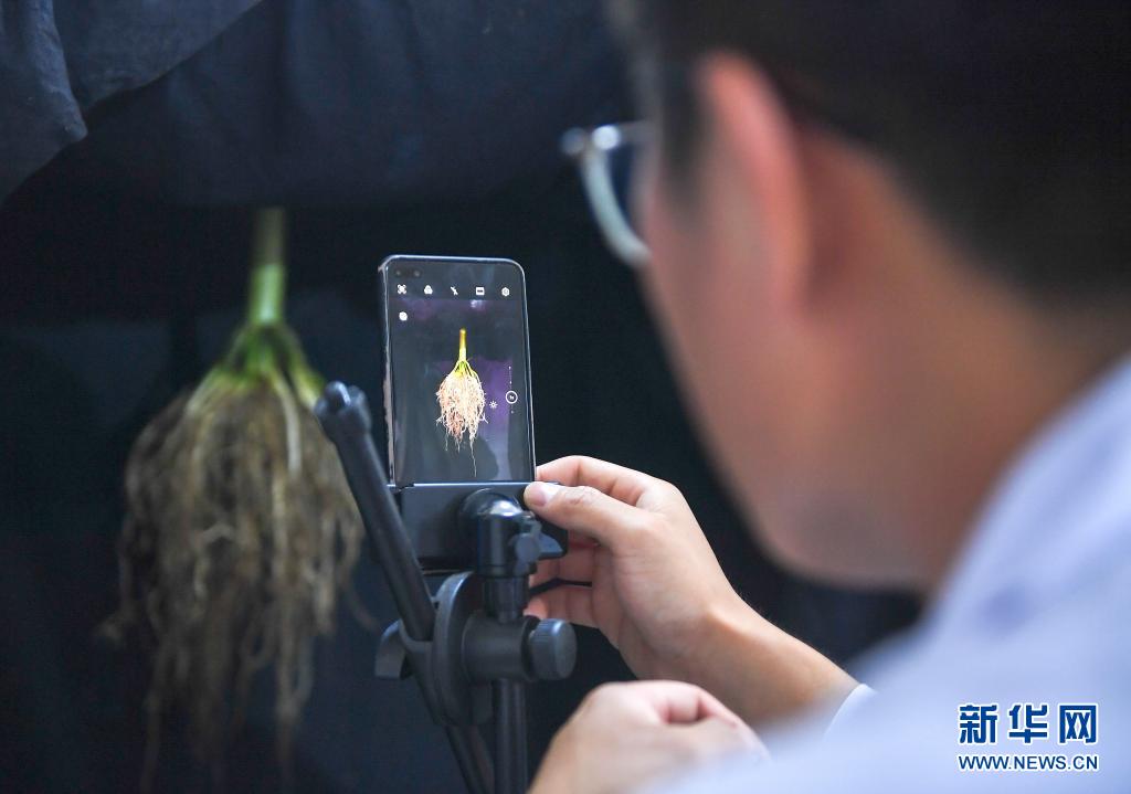 8月2日,在吉林省梨树县四棵树乡三棵树村“科技小院”,中国农业大学博士研究生沙野给玉米根系样本拍照。