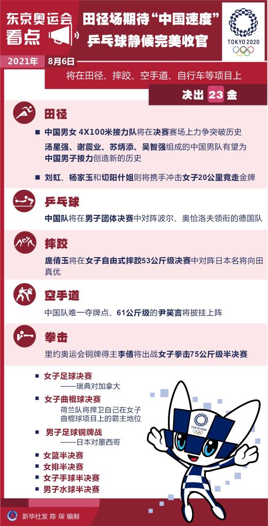 新华社东京8月5日电(记者王恒志 王沁鸥 丁文娴)6日的东京奥运会田径场上有望再次展现“中国速度”,中国男女4X100米接力队将在决赛赛场上力争突破历史,刘虹、杨家玉和切阳什姐则将携手冲击女子20公里竞走金牌。乒乓球将迎来收官战,中国男团志在四连冠。此外在空手道、摔跤等项目上,中国队亦有冲金可能。 中国男女4X100米接力队5日双双闯进决赛,中国男队还以小组第一晋级。6日的决赛赛场,汤星强、谢震业、苏炳添、吴智强组成的中国男队有望为中国男子接力创造新的历史。在札幌举行的女子20公里竞走比赛中,世界纪录保持者杨家玉、卫冕冠军刘虹和老将切阳什姐组成“三保险”,将全力争取卫冕这个项目。 乒乓球项目6日将迎来收官战,中国队将在男子团体决赛中对阵波尔、奥恰洛夫领衔的德国队,卫冕同样是他们的目标。 在其他比赛中,庞倩玉将在女子自由式摔跤53公斤级决赛中对阵日本名将向田真优;在新增项目空手道上,中国队唯一夺牌点、61公斤级的尹笑言将披挂上阵;里约奥运会铜牌得主李倩将出战女子拳击75公斤级半决赛。 6日东京奥运会将在田径、摔跤、空手道、自行车等项目上决出23枚金牌。女足和女子曲棍球将迎来冠军争夺战,瑞典队将和加拿大队争夺女足冠军,荷兰队将捍卫自己在女子曲棍球项目的霸主地位。此外女篮、女排、女子手球和男子水球都将展开半决赛争夺,男子足球将迎来铜牌战,东道主日本队对阵墨西哥队。 |