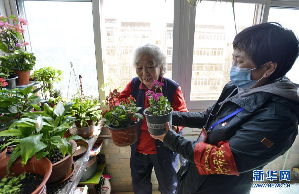北京市丰台区东高地街道党员志愿者冯春红(右)上门看望社区内高龄老人王康凤,了解老人居家生活情况(2020年4月1日摄)。