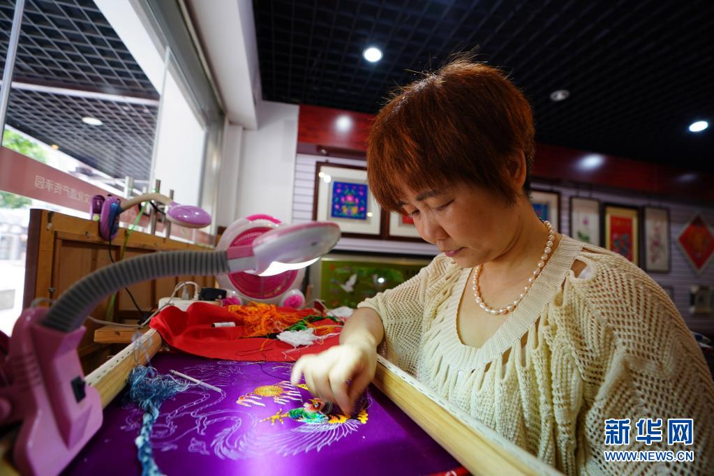 武汉市汉阳区江欣苑社区居民在进行非遗刺绣创作(7月18日摄)。