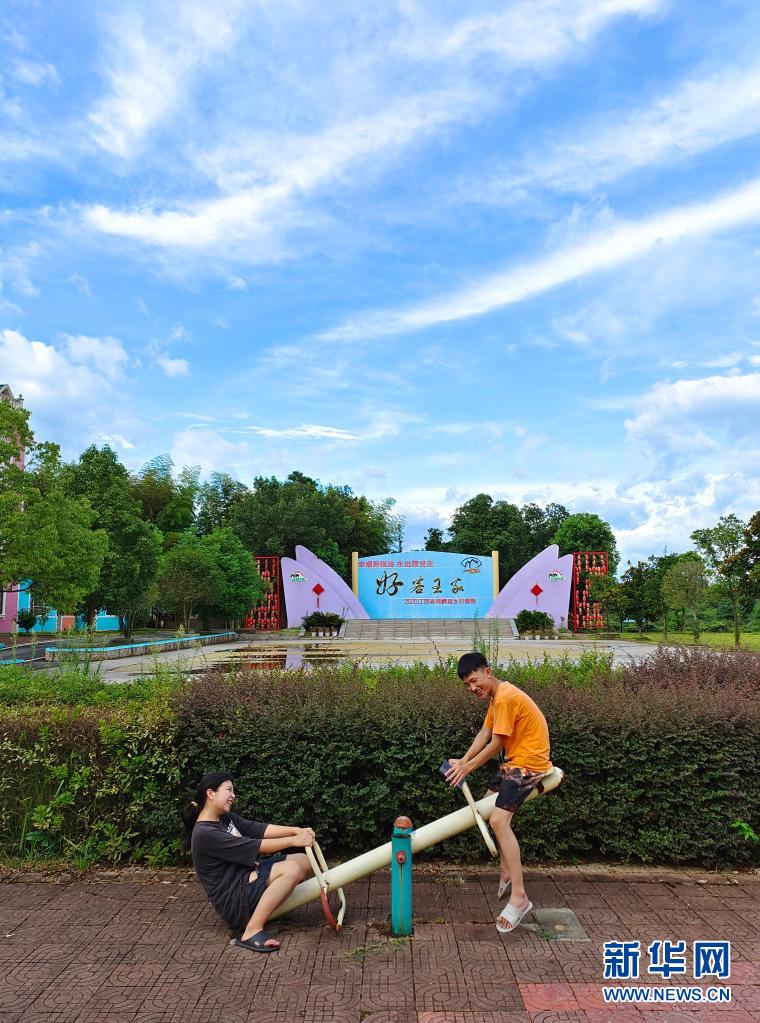 年轻人在江西省上饶市横峰县百家村的好客王家自然村玩耍(7月24日摄,手机照片)。