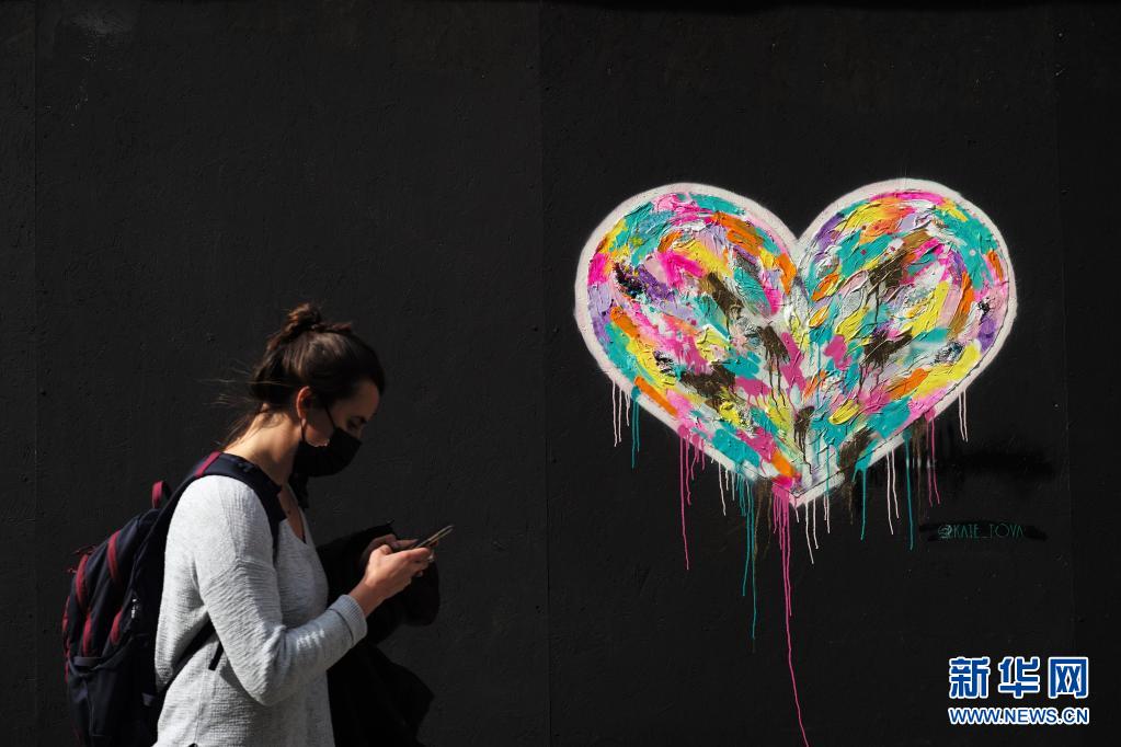 3月24日,行人从美国加利福尼亚州旧金山街头一处心形涂鸦旁走过。