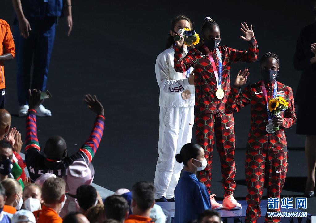 这是肯尼亚选手杰普彻彻、亚军肯尼亚选手科斯盖与美国选手塞德尔在闭幕式举行的颁奖仪式上,她们分获东京奥运会女子马拉松的冠亚季军(8月8日摄)。