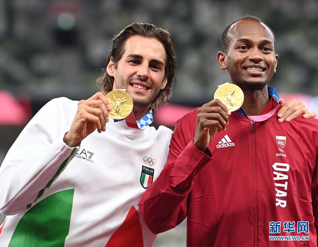 8月2日,卡塔尔选手巴希姆(右)和意大利选手坦贝里共同展示金牌。新华社记者李一博