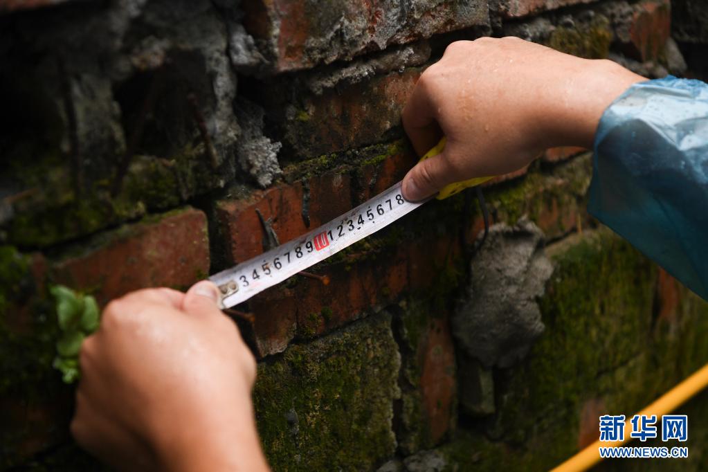 8月8日,重庆市开州区岳溪镇胡家村群测群防员安江波在对地质灾害隐患点的墙裂缝进行测量。