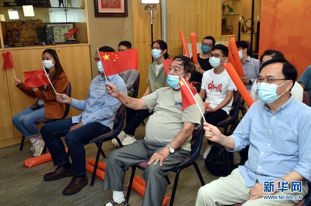 尹广霖(前排右二)在香港观看东京奥运会男子乒乓球半决赛直播(8月4日摄)。