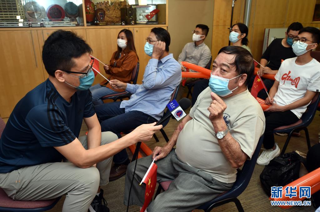尹广霖(前右)在香港接受新华社记者采访(8月4日摄)。