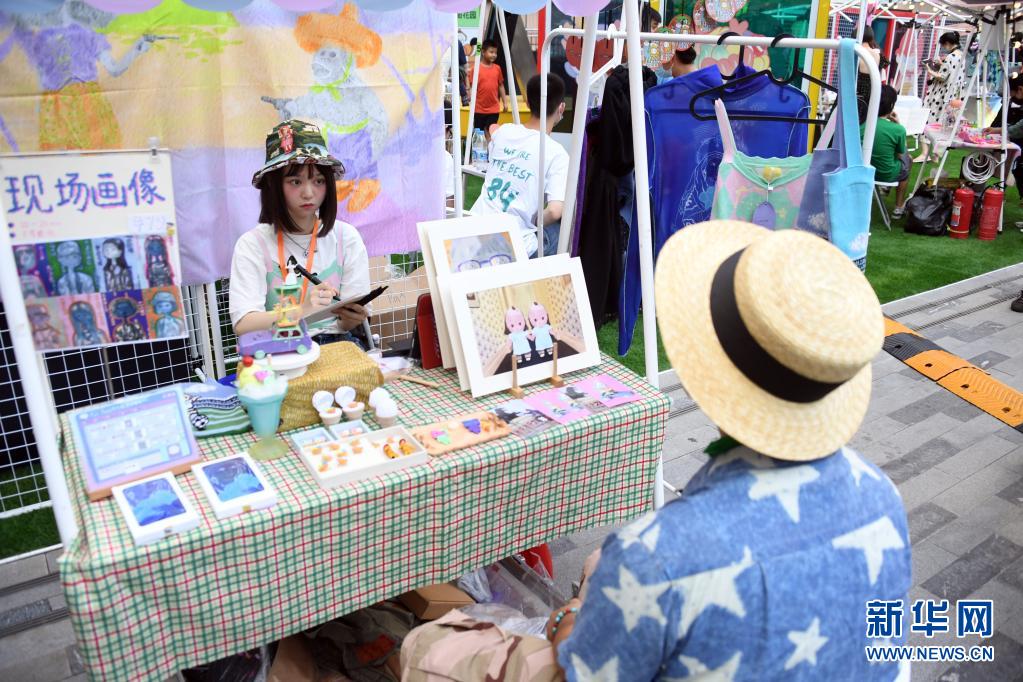 张瑾越在北京apm王府井东街花园举行的艺术展中为观众现场画像(7月24日摄)。 “95后”女孩张瑾越是一名插画师和服装设计师,2020年毕业,目前生活在北京。在进行艺术创作的同时,张瑾越也经营着一家网店,店内所售卖的产品均出自她自己的设计。 绘画、做手工、设计服饰、运营网店、参加线下活动等,都是她的工作内容。为了提高自己的水平,张瑾越会翻阅书籍、参观艺术展、与前辈交流讨教。 张瑾越希望将自己设计的作品与中国文化相结合,设计更多“国潮”产品。“有时碰到素不相识的人穿着我设计的衣服、背着我设计的包,对我来说就是最好的认可!” 新华社记者 任超 摄