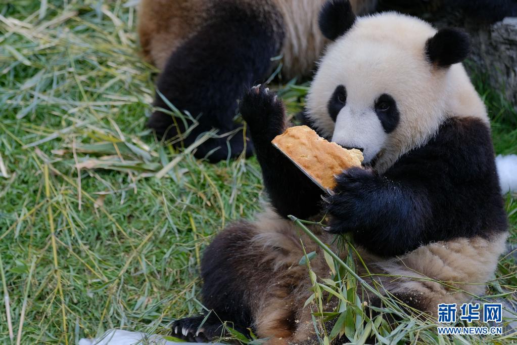 8月8日,大熊猫“宝妹”在比利时布吕热莱特天堂动物园准备享用“生日蛋糕”。 当日,比利时布吕热莱特天堂动物园为大熊猫双胞胎“宝弟”“宝妹”庆祝两岁生日。2014年2月23日,大熊猫“星徽”和“好好”作为中比友好使者来到比利时,2019年8月8日,“好好”诞下双胞胎“宝弟”和“宝妹”。加上2016年6月1日“好好”在比利时产下的雄性幼仔“天宝”,目前共有5只大熊猫在比生活。 新华社记者 张铖 摄