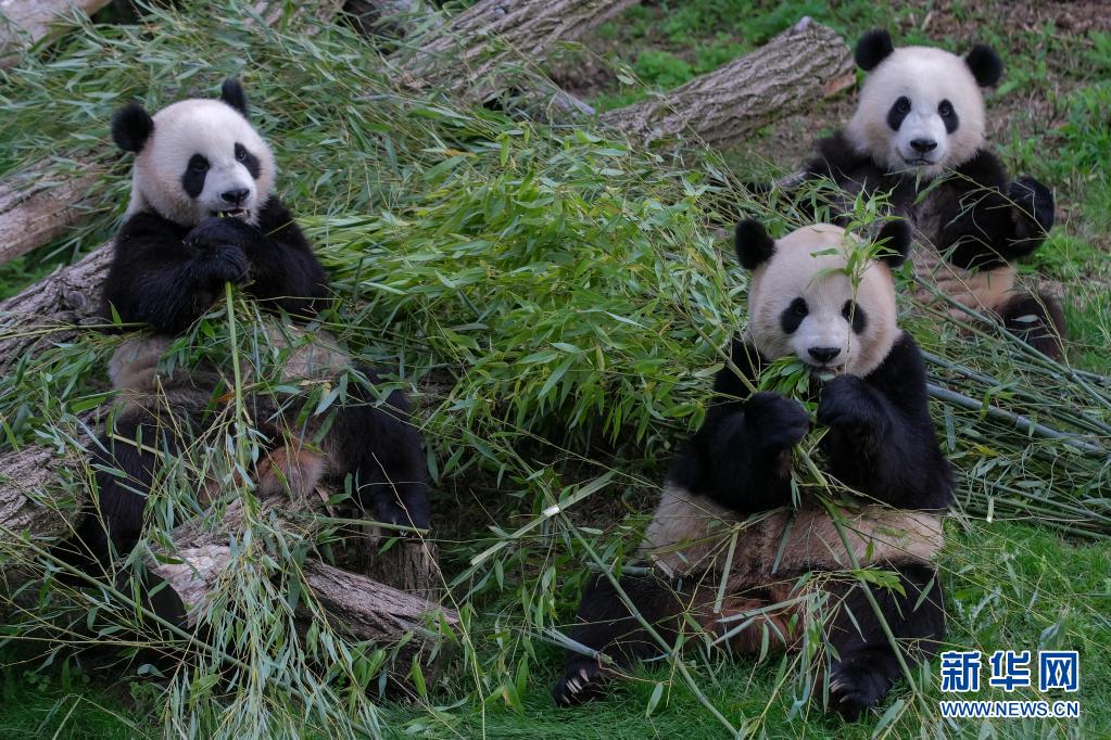 8月8日,在比利时布吕热莱特天堂动物园,大熊猫“宝弟”(右)、“宝妹”(左)和妈妈“好好”一起吃竹子。 当日,比利时布吕热莱特天堂动物园为大熊猫双胞胎“宝弟”“宝妹”庆祝两岁生日。2014年2月23日,大熊猫“星徽”和“好好”作为中比友好使者来到比利时,2019年8月8日,“好好”诞下双胞胎“宝弟”和“宝妹”。加上2016年6月1日“好好”在比利时产下的雄性幼仔“天宝”,目前共有5只大熊猫在比生活。 新华社记者 张铖 摄