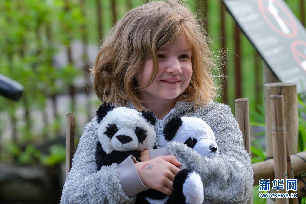 8月8日,在比利时布吕热莱特天堂动物园,一名小朋友手捧玩偶为大熊猫“宝弟”“宝妹”庆祝生日。