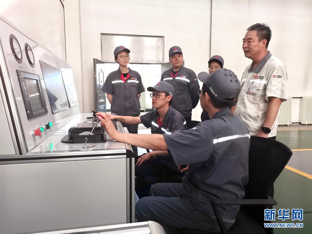 中车齐齐哈尔车辆有限公司党委书记、董事长张玉祥(右一)和基层职工在一起(7月29日摄)。