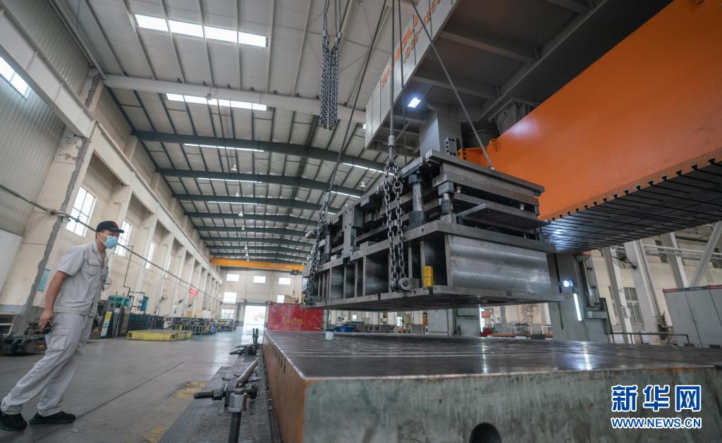 8月12日,工人在河北省黄骅市一家模具企业车间内吊装模具。
