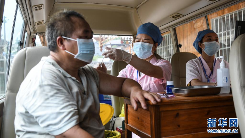 8月12日,广西融安县疫苗接种流动车驶入长安镇安宁村大袍屯为村民接种疫苗。 为帮助山村群众接种新冠疫苗,广西融安县根据县乡道路特点及所辖乡镇农村情况,出动疫苗接种流动车到偏僻山村,打通疫苗接种“最后一公里”。 新华社记者 张爱林 摄