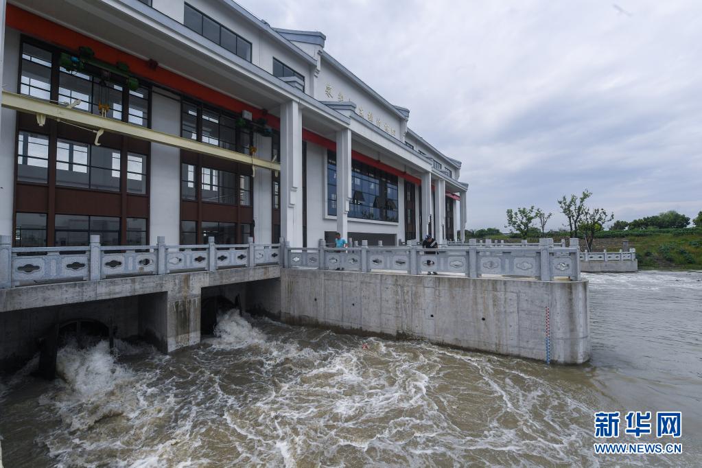 8月12日,塘栖镇的菜籽河东排涝枢纽在往外河排涝。