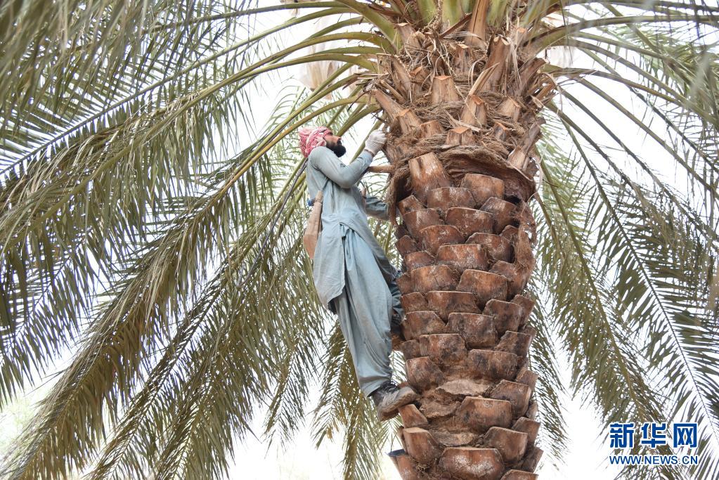 8月12日,工人在沙特阿拉伯加特的一家农场内采摘椰枣。 每年的7月底、8月初,沙特进入椰枣收获季。椰枣营养丰富,易于携带及储存,亦被称为沙漠面包。 新华社记者 王海洲 摄