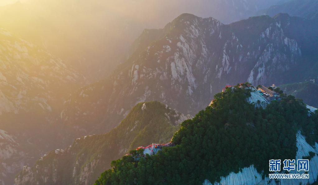 晨曦初露,位于陕西省渭南市的华山景区沐浴在霞光之中,景色壮美。