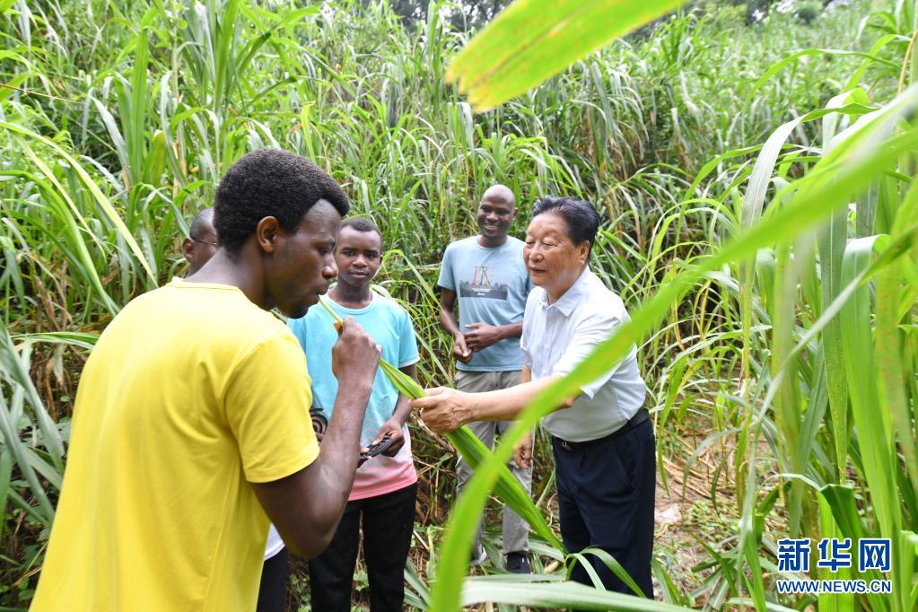 8月12日,福建农林大学国家菌草工程技术研究中心首席科学家林占熺(右一)让卢旺达留学生欧贝德·尼伊姆巴巴兹试尝幼嫩菌草的味道。 新华社记者 林善传 摄 |