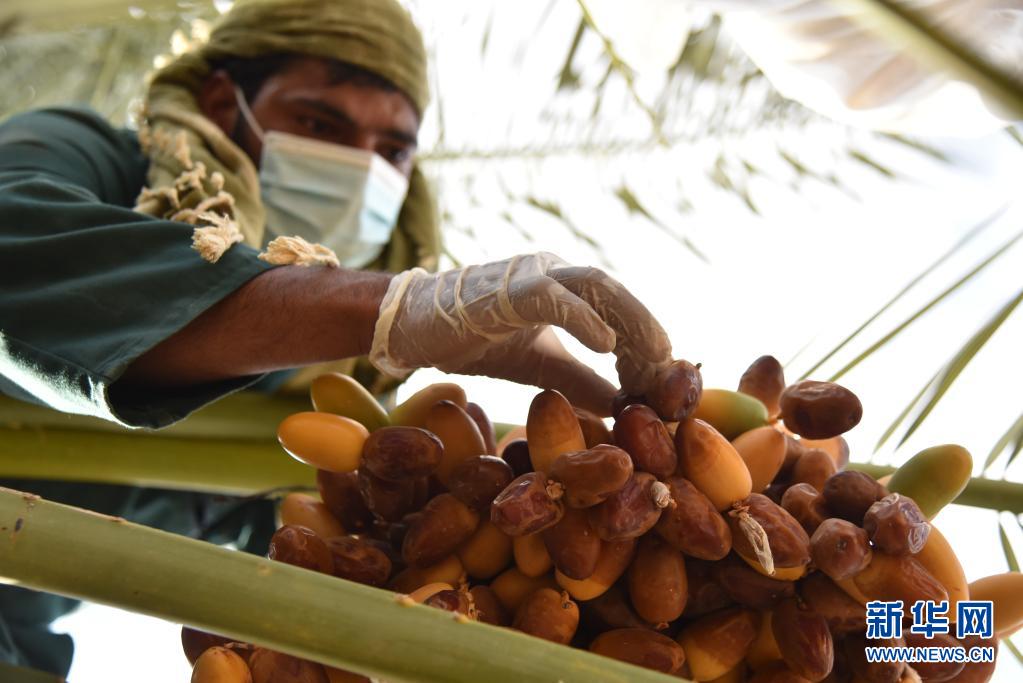 8月12日,工人在沙特阿拉伯加特的一家农场内采摘椰枣。 每年的7月底、8月初,沙特进入椰枣收获季。椰枣营养丰富,易于携带及储存,亦被称为沙漠面包。 新华社记者 王海洲 摄