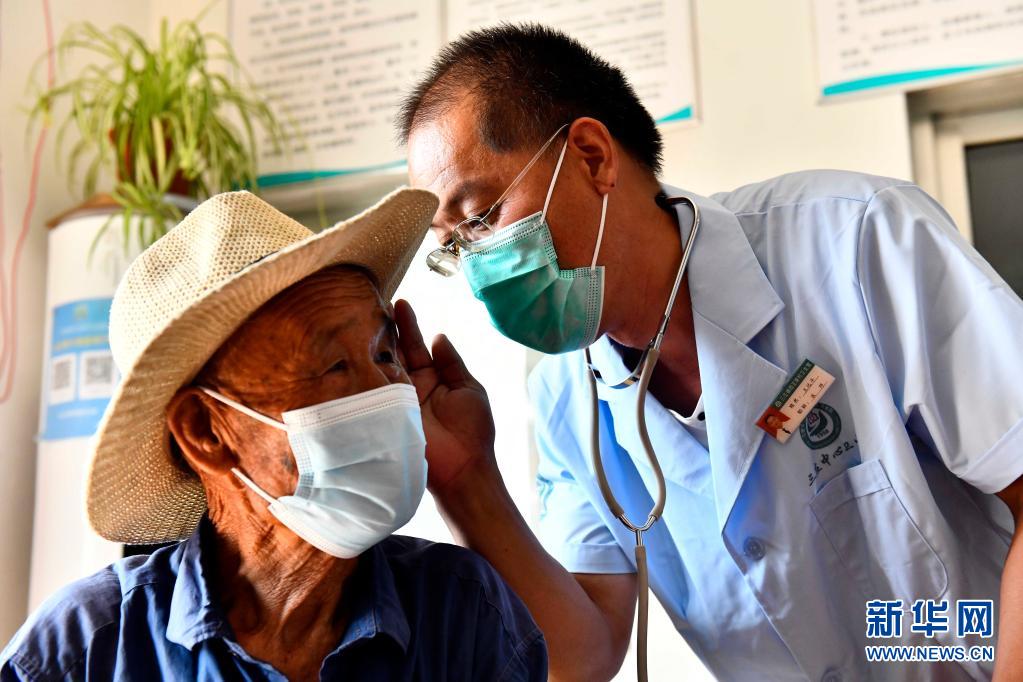 在日照市东港区三庄镇西王家村卫生室,乡村医生王远平在叮嘱耳背的村民注意饮食(8月15日摄)。新华社记者 郭绪雷摄 |