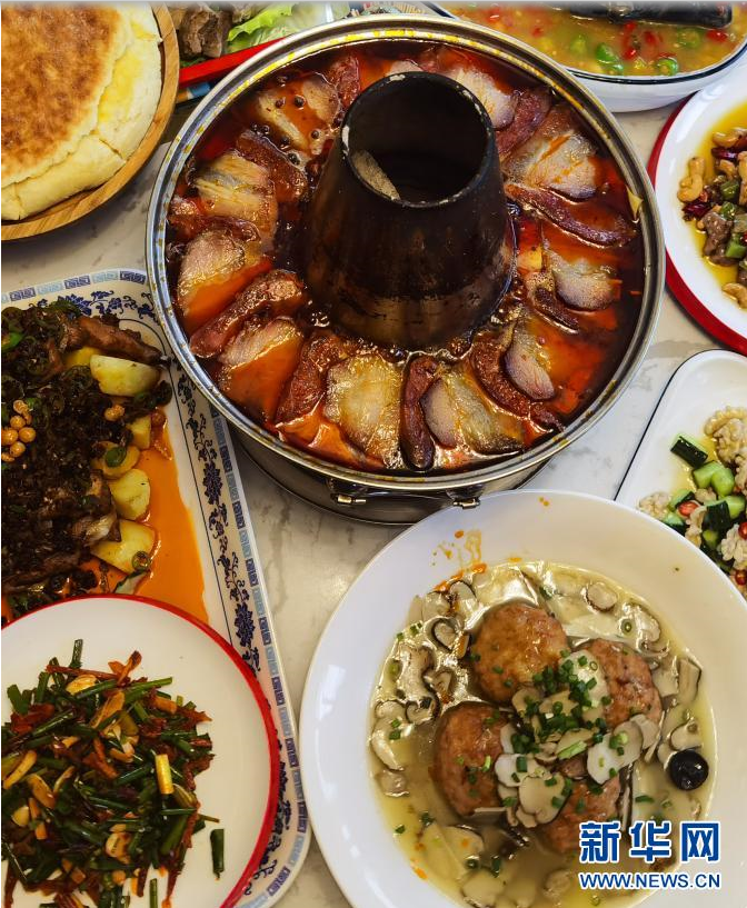 在马尔康市一家餐厅,各种菜肴摆放在餐桌上(8月12日摄)。新华社记者 江宏景 摄 |