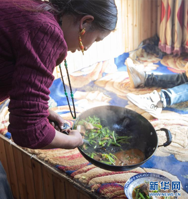 在若尔盖县黑河牧场,牧民纳么措在家里炒芹菜肉片(2月13日摄)。新华社记者 江宏景 摄