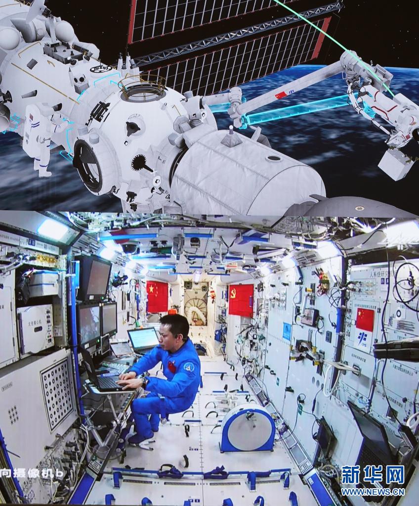 8月20日在北京航天飞行控制中心大屏拍摄的神舟十二号乘组航天员汤洪波在核心舱内工作场景。新华社记者 田定宇 摄 |