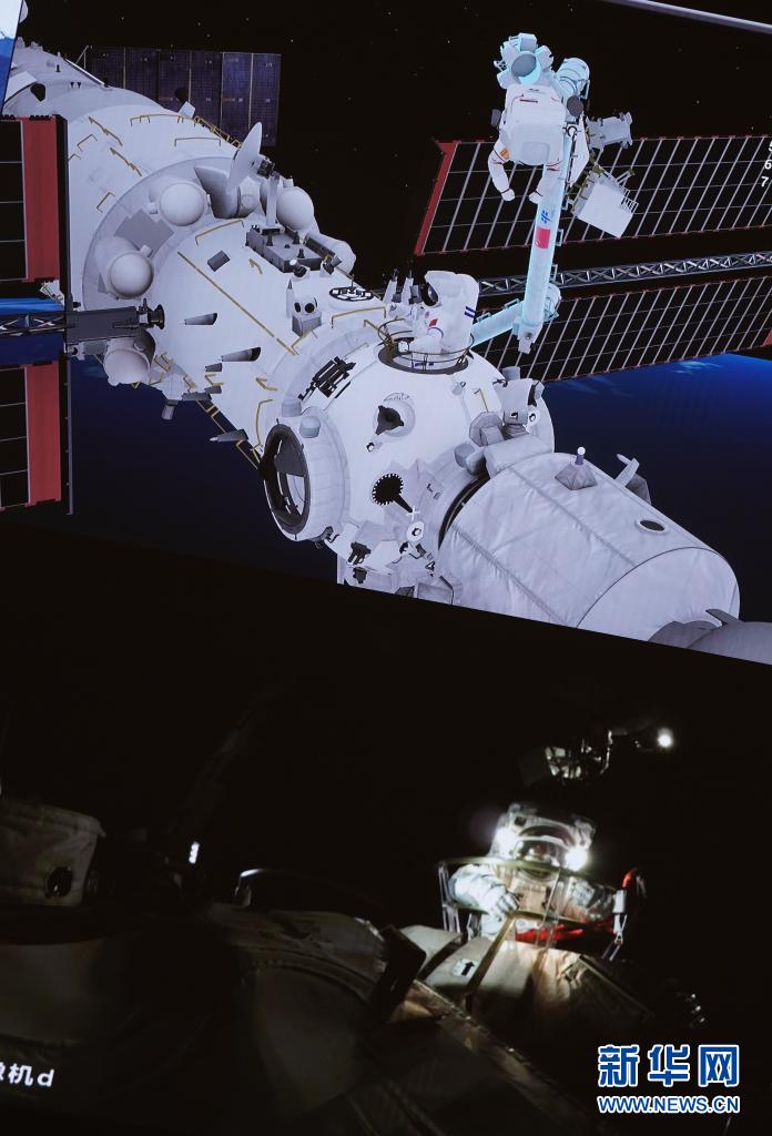 8月20日在北京航天飞行控制中心大屏拍摄的神舟十二号乘组航天员聂海胜、刘伯明同时在舱外操作场景。新华社记者 田定宇 摄 中国载人航天工程办公室表示,期间,在舱内的航天员汤洪波配合支持两名出舱航天员开展舱外操作。