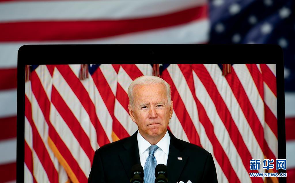 8月16日拍摄的电子屏幕显示,美国总统拜登在华盛顿白宫就阿富汗局势发表讲话。 美国总统拜登16日表示,美军撤出阿富汗是正确决定,他同时承认阿局势恶化快于美方预期。 新华社记者 刘杰 摄