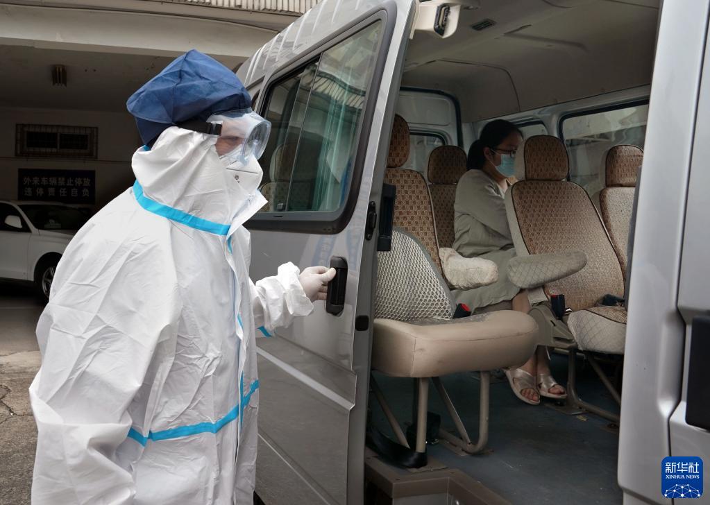 8月24日,在华东师范大学门口,参加演练的防疫人员准备将“发热人员”用专车送至“临时留观点”。