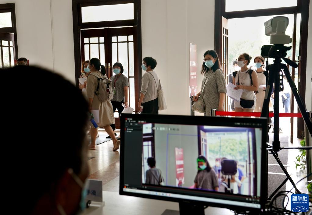 8月24日,在华东师范大学,参加演练的人员进入教学楼时接受测温。 当日,华东师范大学举行2021年秋季学期开学疫情防控演练,以进一步做好开学期间校园防疫工作。 新华社记者 刘颖 摄