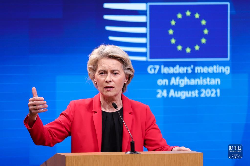8月24日,在比利时布鲁塞尔,欧盟委员会主席冯德莱恩在记者会上发言。 欧洲理事会主席米歇尔在七国集团领导人视频会议后的记者会上表示,欧盟向美国以及其他合作伙伴提出了两个要求:一是应确保喀布尔机场的安全,直到撤离任务全部完成;二是所有符合撤离条件的人都能公平地进入机场。一同出席记者会的欧盟委员会主席冯德莱恩呼吁全球合作,以确保流离失所的阿富汗人不会落入人贩子手中。 新华社记者 郑焕松 摄
