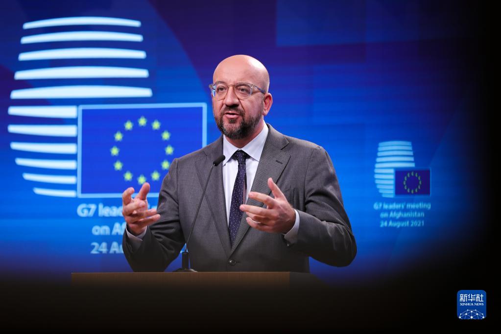8月24日,在比利时布鲁塞尔,欧洲理事会主席米歇尔在记者会上发言。 欧洲理事会主席米歇尔在七国集团领导人视频会议后的记者会上表示,欧盟向美国以及其他合作伙伴提出了两个要求:一是应确保喀布尔机场的安全,直到撤离任务全部完成;二是所有符合撤离条件的人都能公平地进入机场。一同出席记者会的欧盟委员会主席冯德莱恩呼吁全球合作,以确保流离失所的阿富汗人不会落入人贩子手中。 新华社记者 郑焕松 摄