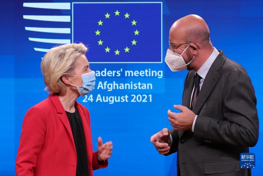 8月24日,在比利时布鲁塞尔,欧洲理事会主席米歇尔(右)与欧盟委员会主席冯德莱恩出席记者会。 欧洲理事会主席米歇尔在七国集团领导人视频会议后的记者会上表示,欧盟向美国以及其他合作伙伴提出了两个要求:一是应确保喀布尔机场的安全,直到撤离任务全部完成;二是所有符合撤离条件的人都能公平地进入机场。一同出席记者会的欧盟委员会主席冯德莱恩呼吁全球合作,以确保流离失所的阿富汗人不会落入人贩子手中。 新华社记者 郑焕松 摄
