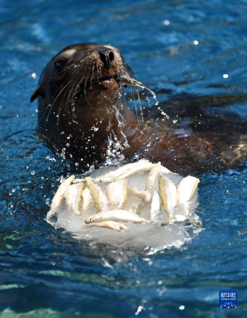 8月26日,一只海狮在意大利罗马动物园享用冰冻食物。