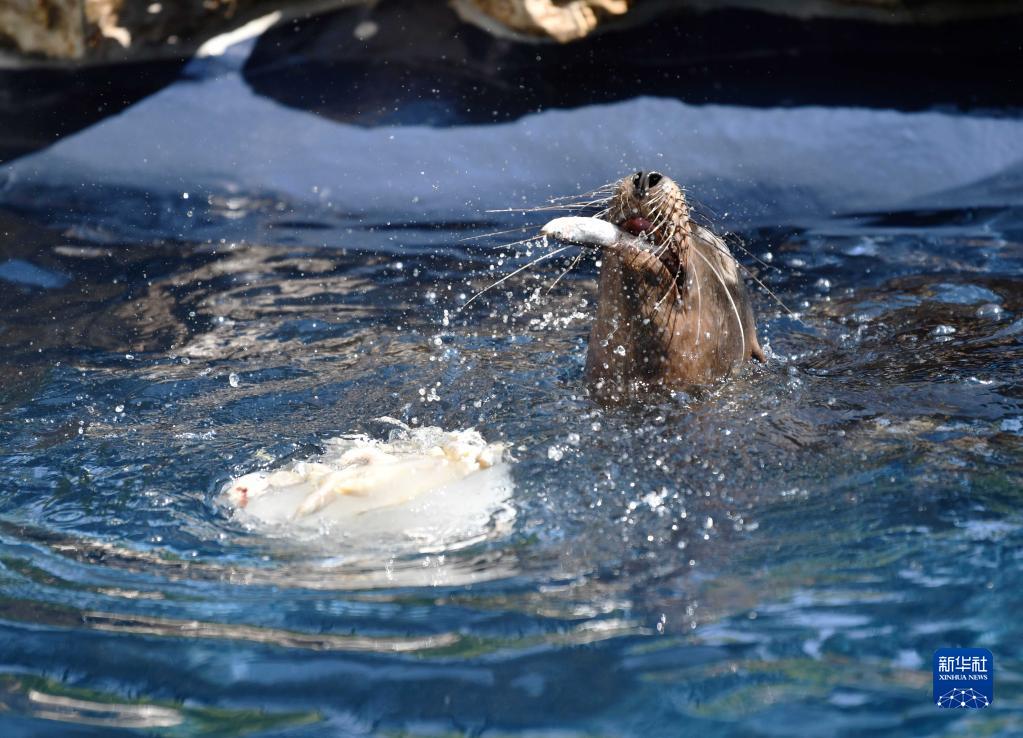 8月26日,一只海狮在意大利罗马动物园享用冰冻食物。 夏日炎炎,意大利罗马动物园的工作人员为动物提供冰冻或冰镇食物,帮助它们解暑。 新华社记者 金马梦妮 摄