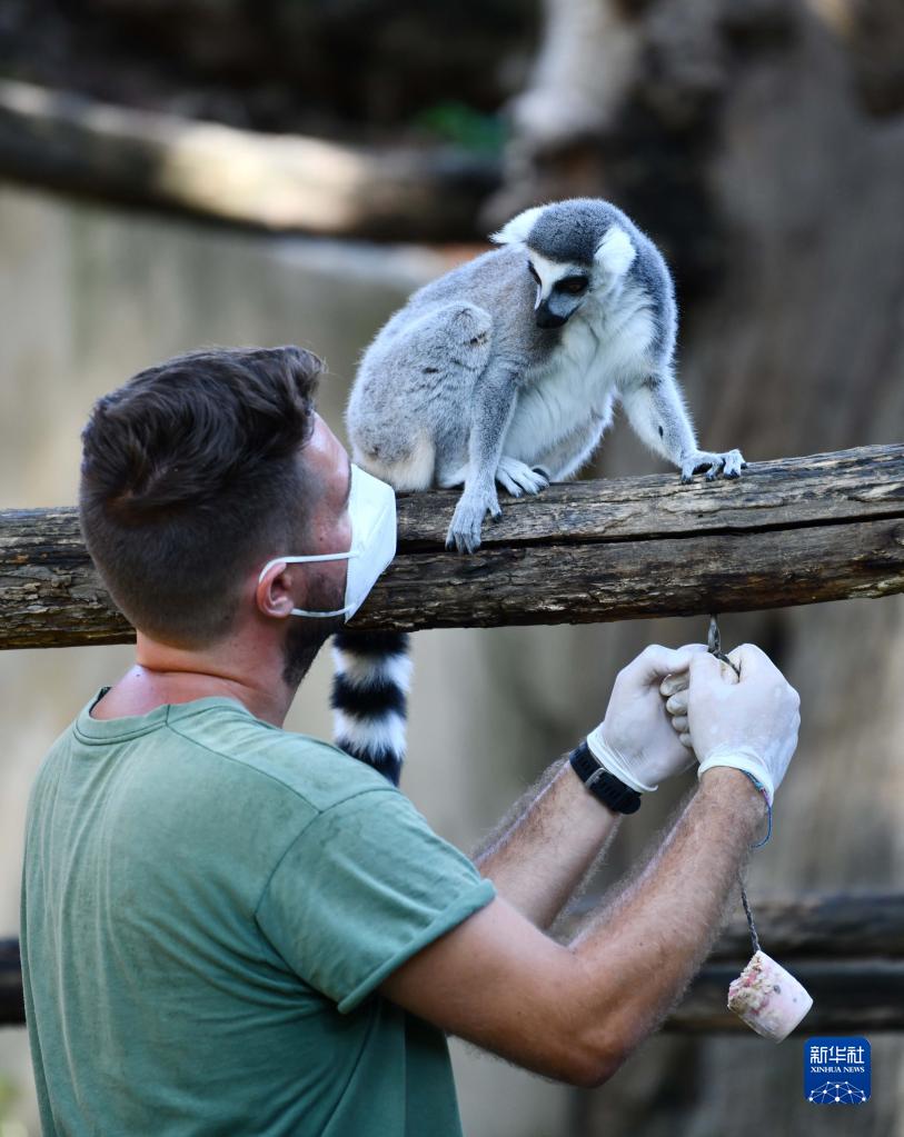 8月26日,意大利罗马动物园的工作人员为环尾狐猴送去冰冻果蔬。 夏日炎炎,意大利罗马动物园的工作人员为动物提供冰冻或冰镇食物,帮助它们解暑。 新华社记者 金马梦妮 摄