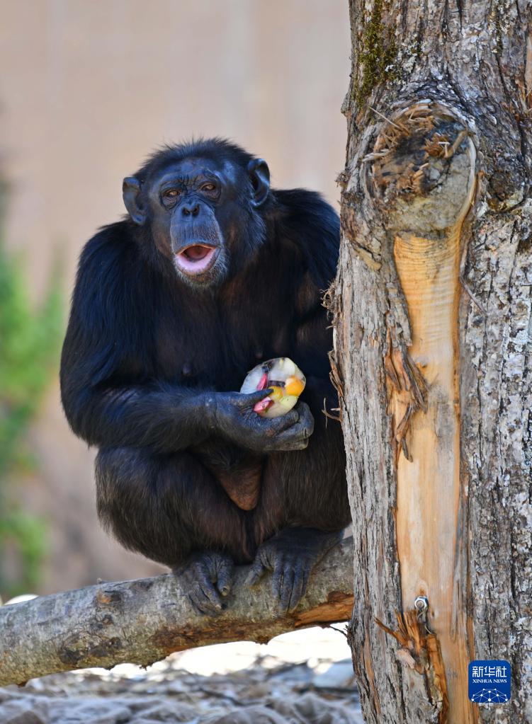 8月26日,一只黑猩猩在意大利罗马动物园享用冰冻食物。 夏日炎炎,意大利罗马动物园的工作人员为动物提供冰冻或冰镇食物,帮助它们解暑。 新华社记者 金马梦妮 摄