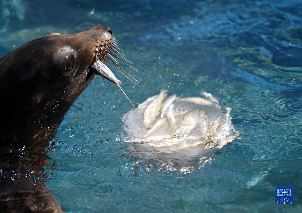 8月26日,一只海狮在意大利罗马动物园享用冰冻食物。