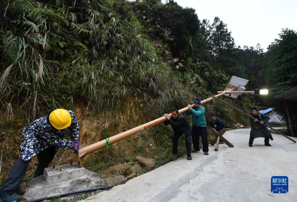 广西融水苗族自治县杆洞乡党鸠村村民在安装太阳能路灯(2020年12月1日摄)。 8月23日至29日是全国节能宣传周,主题是“节能降碳,绿色发展”。随着脱贫攻坚战的全面胜利和乡村振兴战略的实施,广西大石山区的千山万弄里竖起一盏盏太阳能路灯,这些路灯不仅在夜间为村民照亮山路,更为村民点亮改变家乡面貌、振兴乡村的希望。 新华社记者 黄孝邦 摄