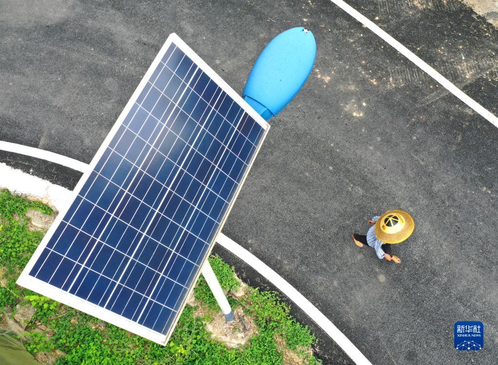 村民从广西恭城瑶族自治县平安镇北溪村毛笔山自然村太阳能路灯旁经过(无人机照片,7月22日摄)。 8月23日至29日是全国节能宣传周,主题是“节能降碳,绿色发展”。随着脱贫攻坚战的全面胜利和乡村振兴战略的实施,广西大石山区的千山万弄里竖起一盏盏太阳能路灯,这些路灯不仅在夜间为村民照亮山路,更为村民点亮改变家乡面貌、振兴乡村的希望。 新华社记者 周华 摄