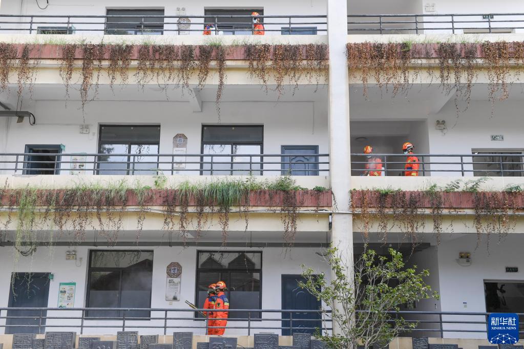 8月28日,福州市消防救援支队鼓楼大队消防人员在福州乌山小学开展消杀工作。