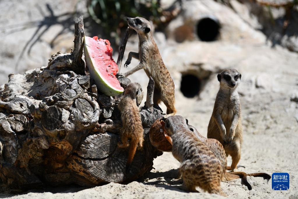 8月26日,猫鼬在意大利罗马动物园享用冰镇西瓜。