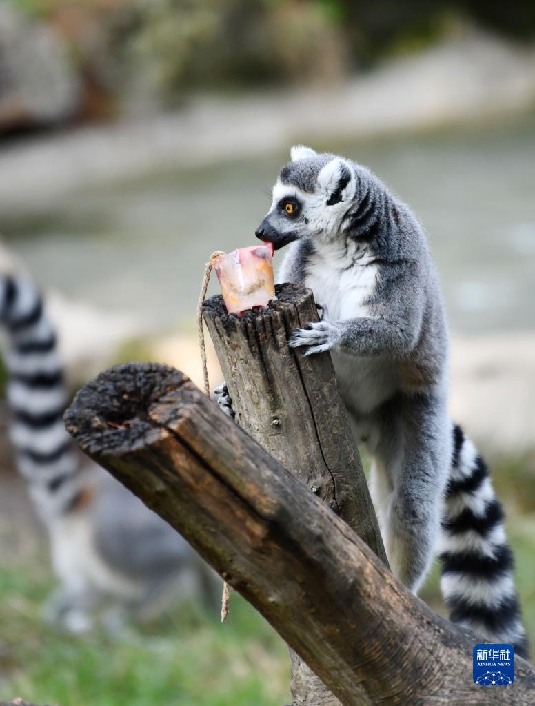 8月26日,一只环尾狐猴在意大利罗马动物园享用冰冻果蔬。