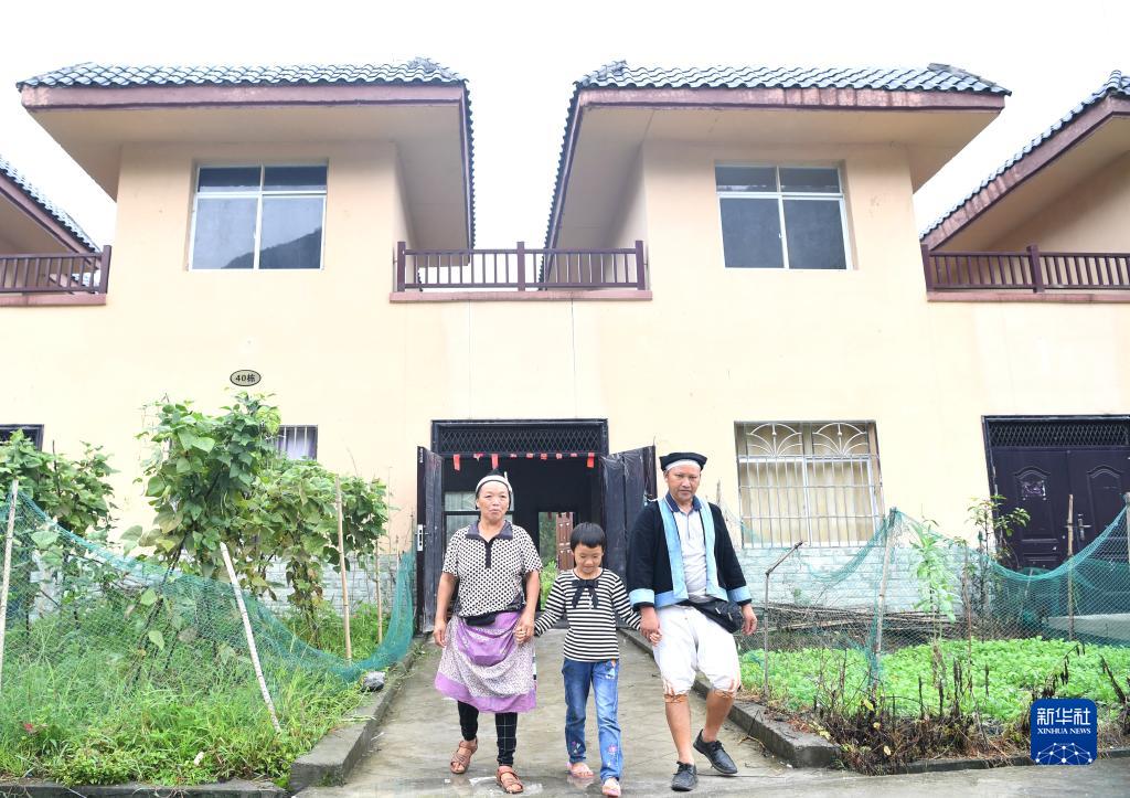 在广西南丹县八圩瑶族乡瑶寨移民安置点,村民黎治明(右)一家走出新家家门(2020年8月6日摄)。 新华社记者 周华 摄