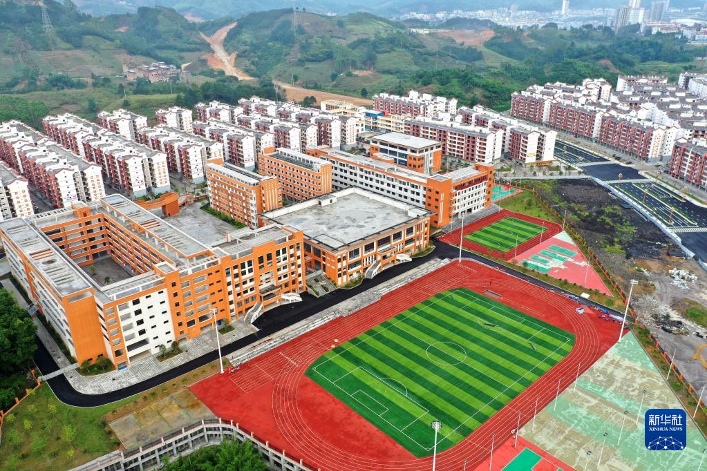 广西环江毛南族自治县毛南家园易地扶贫搬迁城北安置区外新的学校(2020年5月21日摄,无人机照片)。 新华社记者 周华 摄
