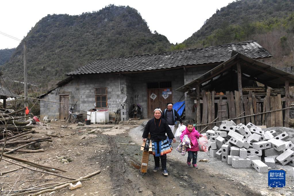 黎治明(后)一家从广西南丹县八圩瑶族乡吧哈村自己家里出来,准备搬往新家(2018年2月4日摄)。 新华社记者 周华 摄