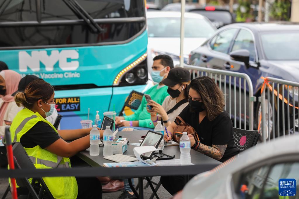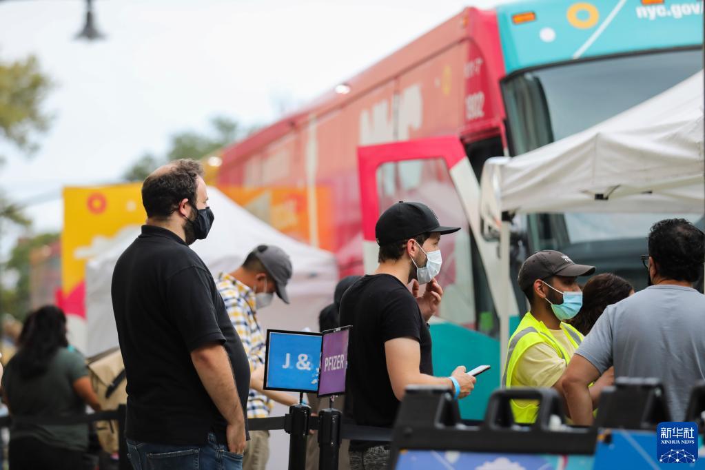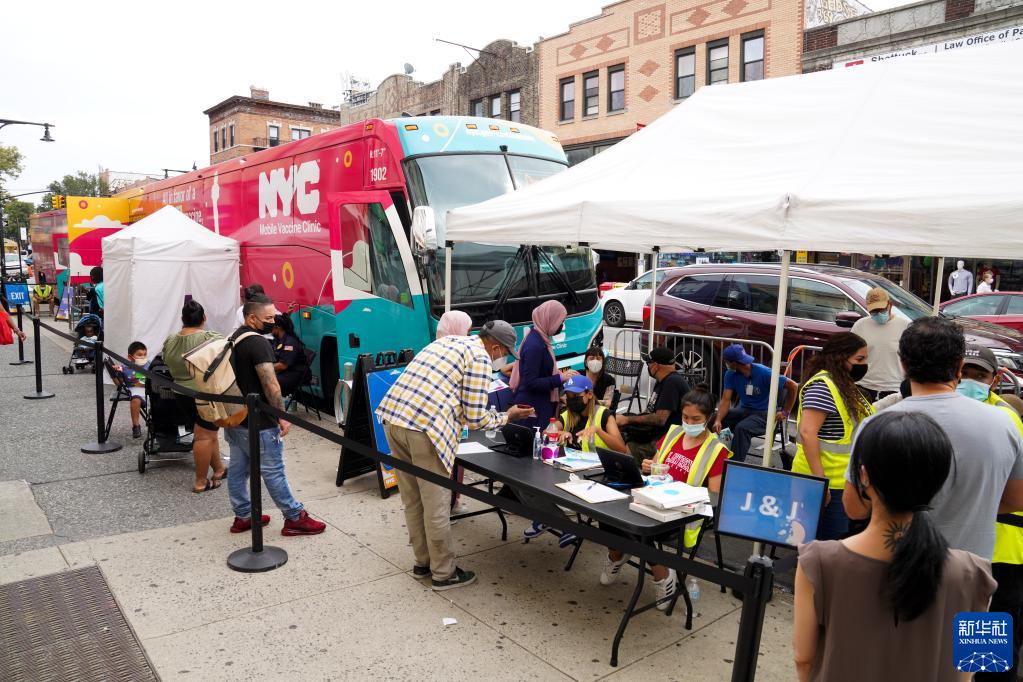 8月31日,人们在美国纽约街头的流动疫苗接种车外排队等候接种新冠疫苗。 约翰斯·霍普金斯大学数据显示,美国截至8月23日至29日的7天内,累计新增新冠确诊病例108.9万例,累计死亡病例9036例。 新华社记者 王迎 摄